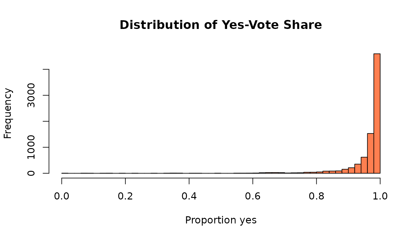 main = "Distribution of Yes-Vote Share", xlab = "Proportion yes")